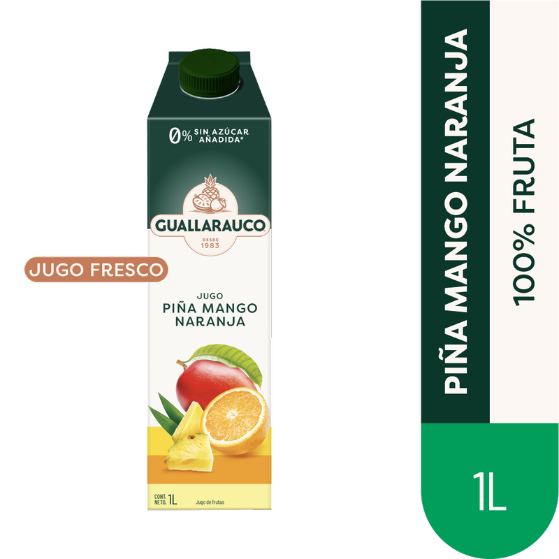 Jugo de Mango Piña Naranja, preparado con fruta cuidadosamente seleccionada y cosechada en su punto óptimo de madurez.